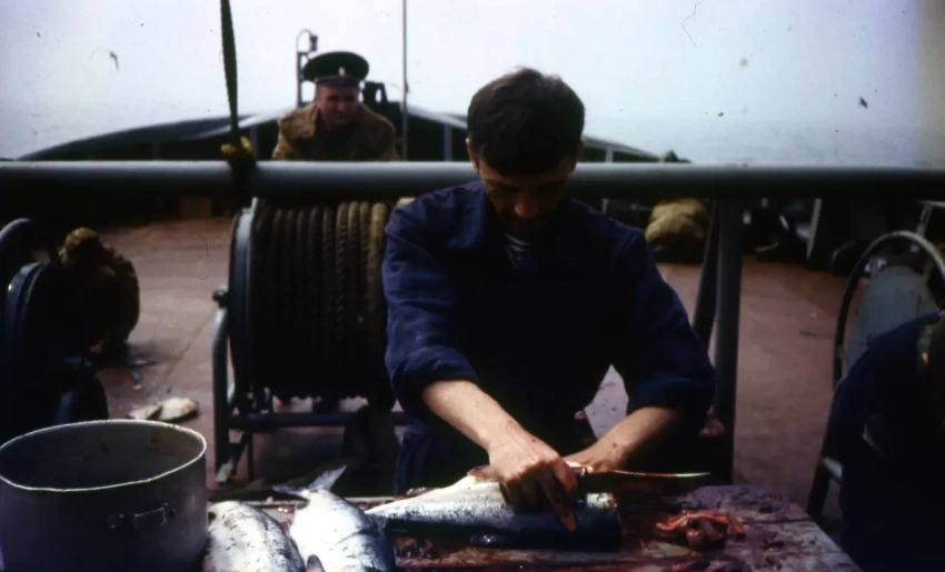 Несколько фотографий такого «размагничивания» сохранилось, выглядит всё довольно забавно — раздел выловленной красной рыбы на икру и тушки на засолку. Экипаж потреблял икру весь поход, и потом уже смотрел на неё как на перловку…