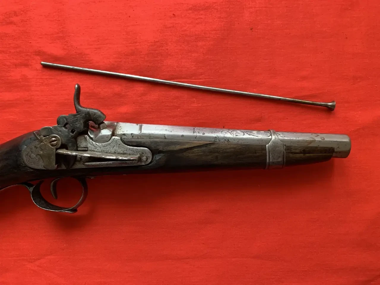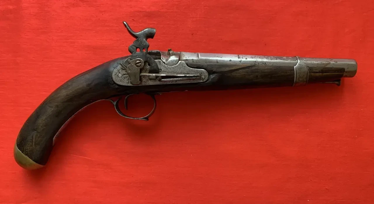 Вот он, этот пистолет, о котором пойдет речь. Он капсюльный, но вот замок у него от кремневого пистолета. Вес 1 кг. Калибр 15,7-мм. Фотография автора