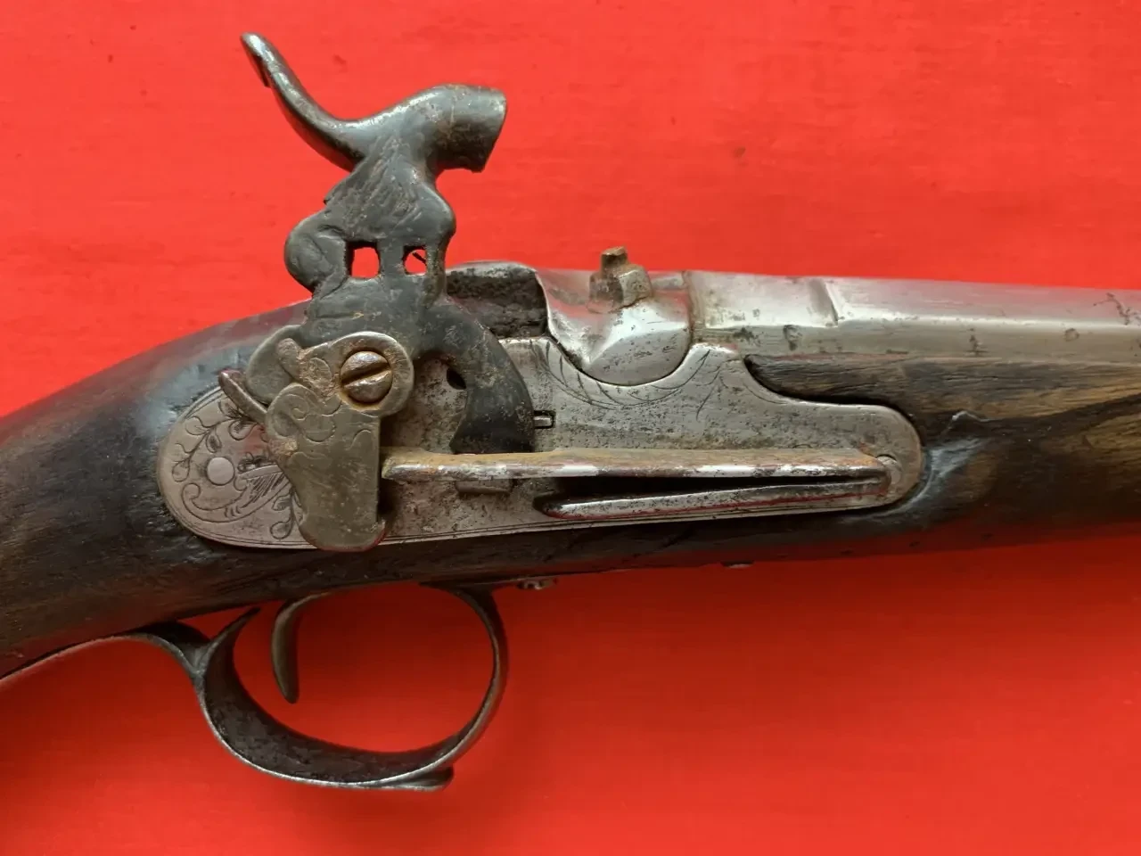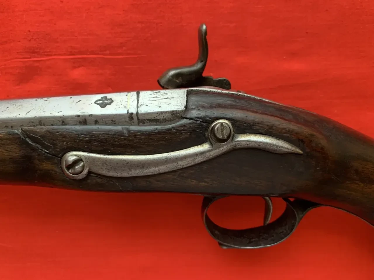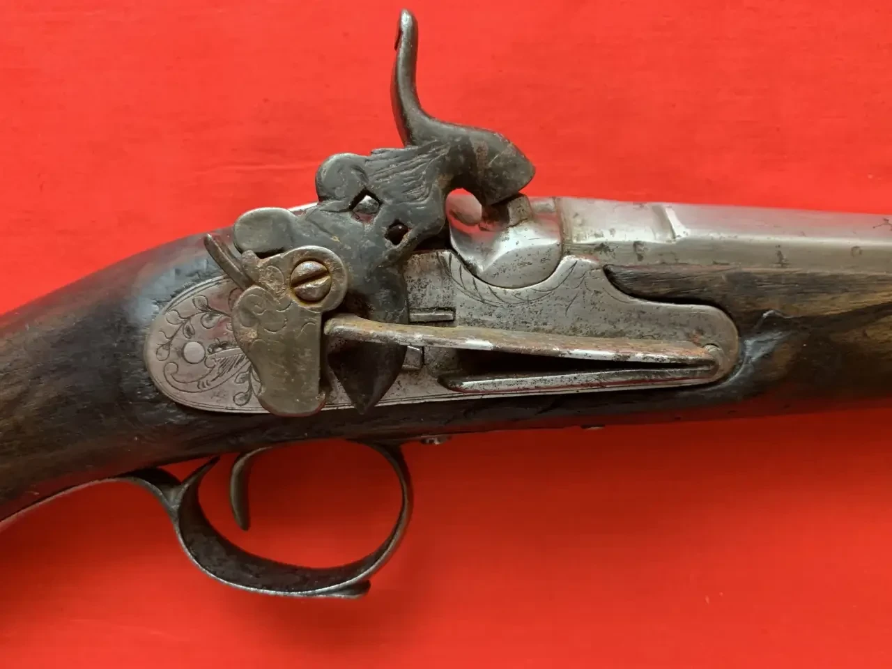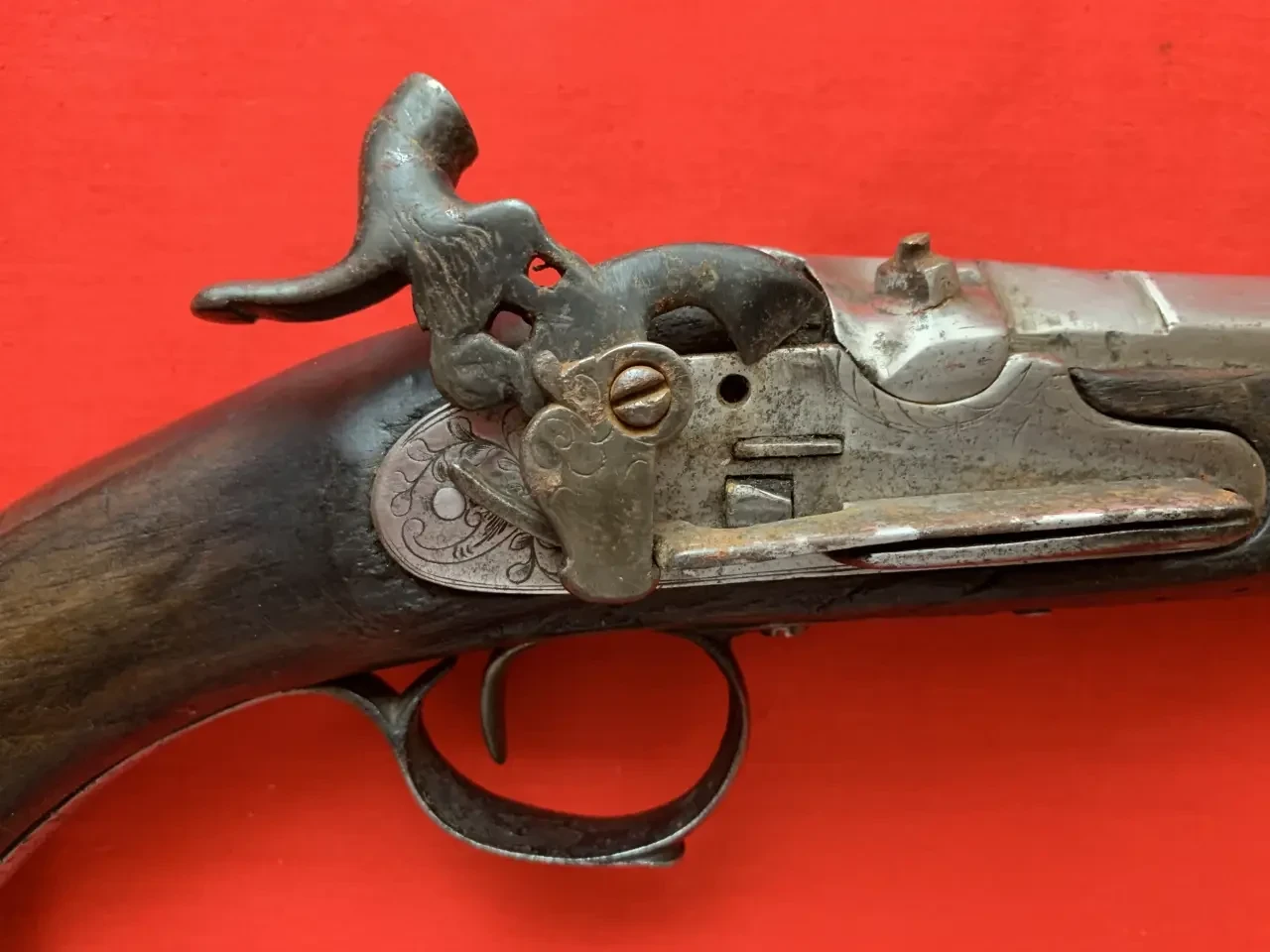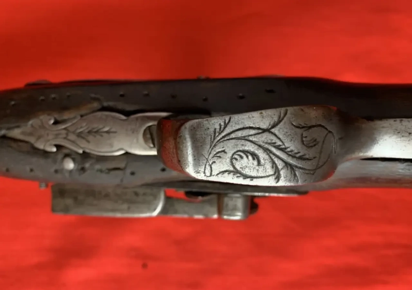 Скоба спускового крючка украшена гравировкой. Видна прямоугольная прорезь на боевой пружине для движения изогнутого носка курка