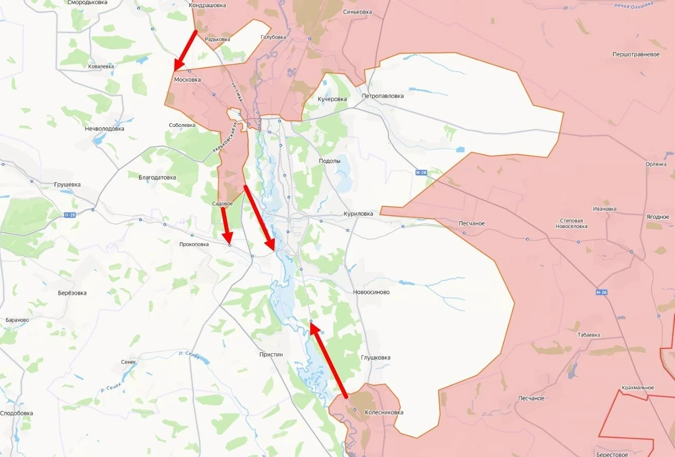 Далее, на Краснолиманском направлении, взяты Новосёловка, Ставки и Масляковка. Участок вдоль реки Нетриус уже под контролем российских подразделений, что позволило приблизиться к Северскому Донцу и обойти Яровую с востока. В Дробышево российские бойцы закрепились в восточной части посёлка. После взятия Масляковки появляется более удобный путь для дальнейшего продвижения в сторону Красного Лимана. Украинские источники признают, что российские разведгруппы уже действуют на восточных улицах города, боевиков теснят к центру города.