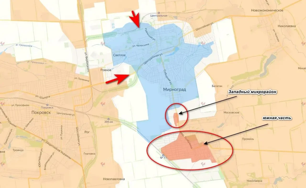 Российские штурмовые группы продвигаются в южной части Димитрова (Мирноград) и мкр. Западный.