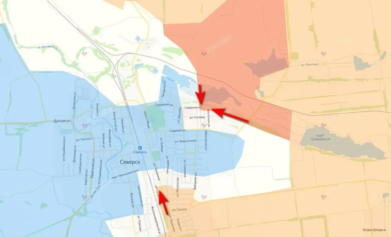 Штурмовые подразделения группировки войск «Южная» вошли в Северск еще с одной стороны, на этот раз с северной и северо-восточной. Нашим удался хороший рывок и заход в первые дома по улицам Восточная, Кошевого и Северная со стороны пруда Поселковый. На данный момент наши штурмовики закрепились в жилой застройке и начали расширять зону контроля. Противник пытается выбить наших с занятых позиций, но безуспешно.