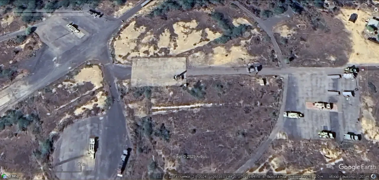 Спутниковый снимок Google Earth: позиция ЗРК Akash на авиабазе Гвалиор. Снимок сделан в феврале 2024 года