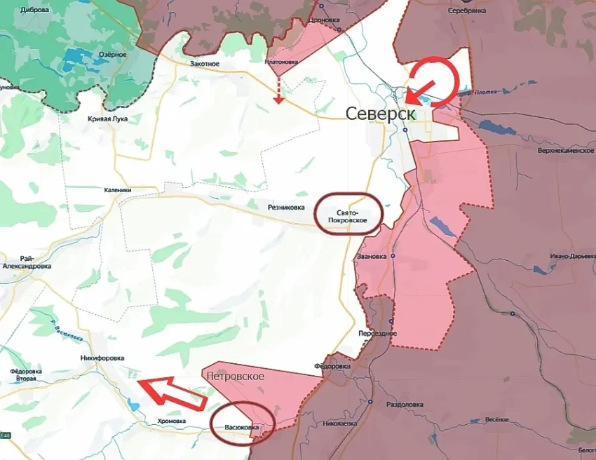 К югу бои идут в районе Свято-Покровского, с северного фланга наши продолжают охват города со стороны Платоновки. Логистика врага в Северске нарушается ударами артиллерии, ВКС и беспилотной авиации ВС РФ. Город постепенно переходит в тактическое окружение, хотя, судя по боям в самом Северске, противник может быть выбит из него раньше. Наученные горьким опытом обороны других фортеций, откуда даже при угрозе полного окружения ВСУ не получали приказов на отход, украинские боевики могут на свое усмотрение начать бегство.