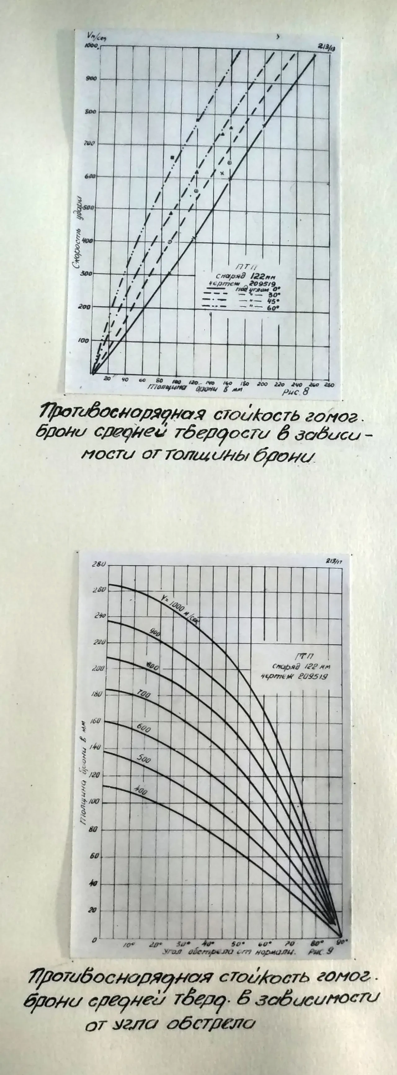 Однако, используя трофейные материалы Хиллерслебенского полигона, подробно о которых будет сказано ниже, данные Кубинского полигона по испытанию опытного объекта «260» немецкими 128-мм снарядами и имеющиеся данные по обстрелу отечественной брони немецкими снарядами меньших калибров, расчетным путем были получены тактические диаграммы противоснарядной стойкости отечественной гомогенной брони также против снарядов и этого калибра.