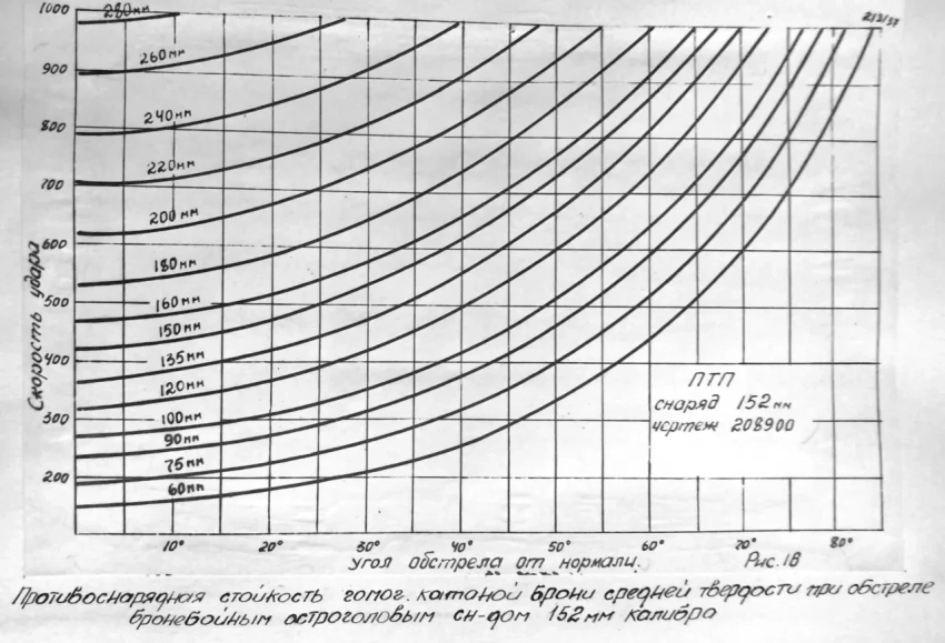 Таким образом, можно предположить, что представленные графические материалы по противоснарядной стойкости гомогенной брони в пределах реальных скоростей отечественных пушек калибров 100–152 мм с достаточной для практики точностью отражают тактические свойства гомогенной брони при различных условиях испытания и поэтому для этих скоростей снарядов могут быть рекомендованы как основной материал при расчете броневой защиты от снарядов этих калибров.