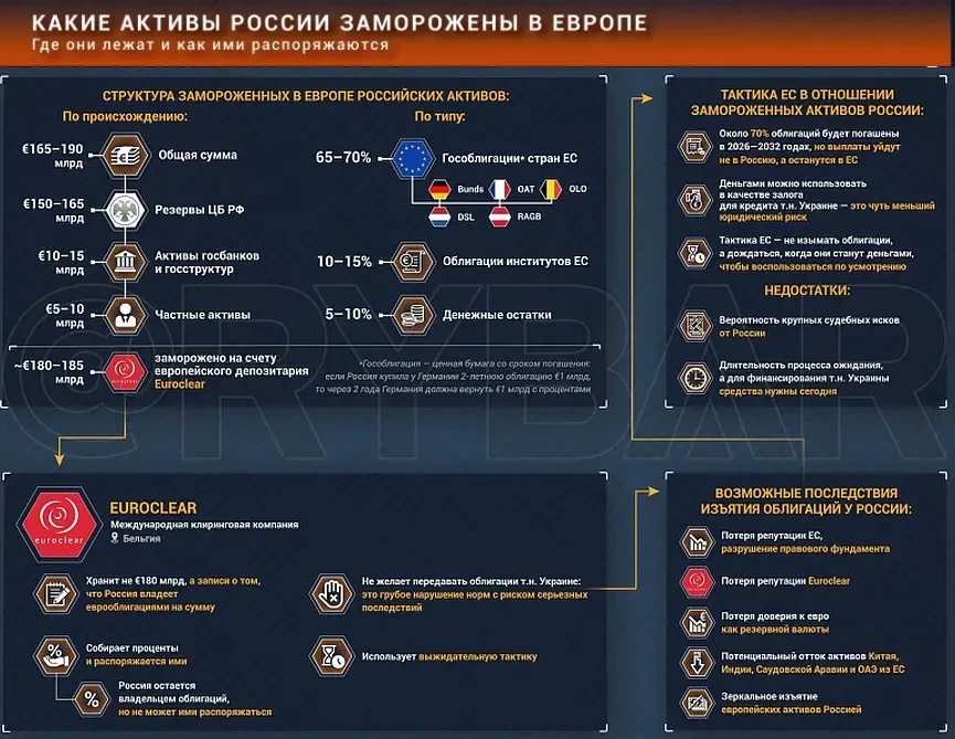 К слову, многие в России считают, что арестованные на Западе активы ЦБ РФ — это материальные золото-валютные резервы Центробанка. Это ошибочное мнение, физических денег, а уж тем более золотых слитков, там нет. На деле передать активы можно только сменой владельца облигаций с РФ на т.н. Украину в реестре Euroclear. Провести такую операцию в рамках действующего законодательства невозможно. Это чревато серьезными последствиями не только для Бельгии, но и всего Евросоюза и евро как валюты.