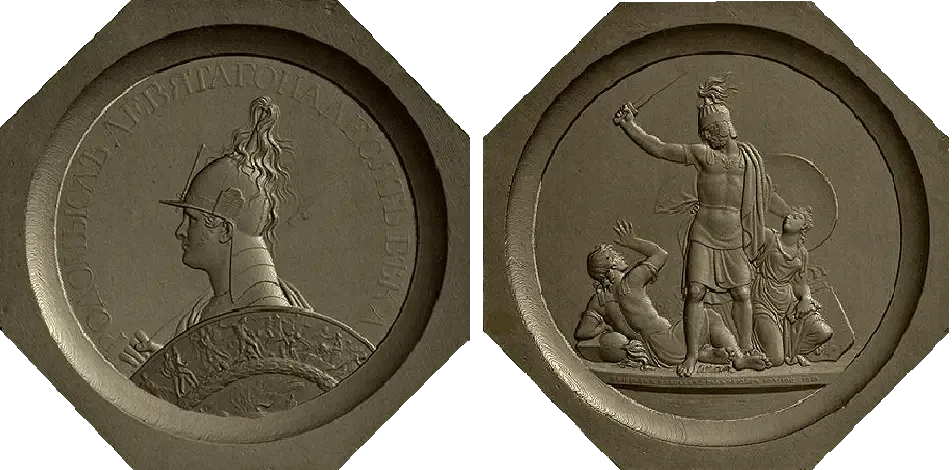 «Вооруженный мечом Русский воин, единою рукою поражая поверженного к ногам своим врага, другою, держащею щит, дружественно покрывает подносящую эту ключи от града Голландскую в виде жены столицу, и, утешая вещает ей: под щитом моим успокойся»