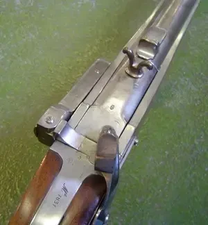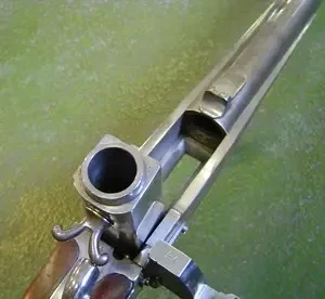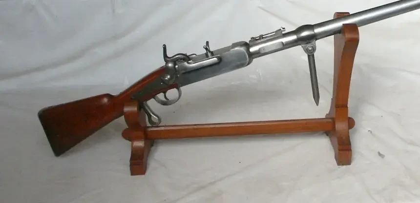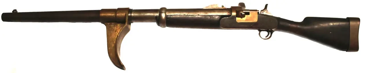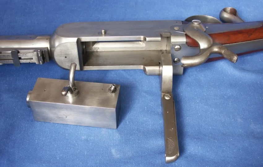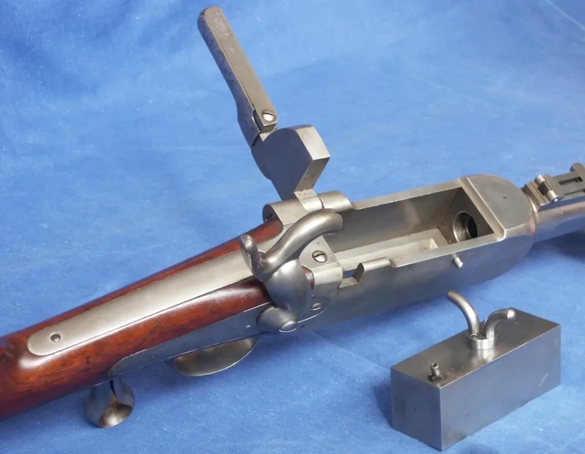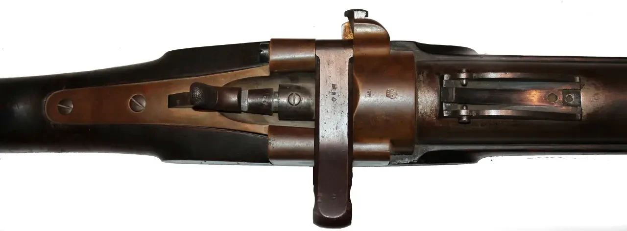 Винтовка была капсюльной, поэтому затвор имел форму стального бруска. V-образные «ушки» на затворе служили рукоятками для его извлечения из затворной коробки. Фото littlegun.be