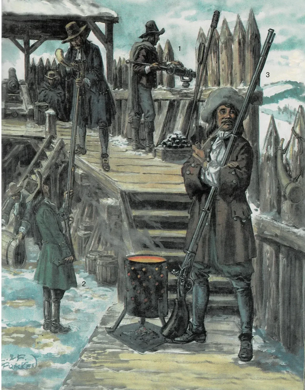 Рисунок, изображающий стрелков с этими двумя мушкетами (2 — 1714 г., 3 — 1670 г.) на американском форту из книги Лилианы и Фреда Функенов «Энциклопедия вооружения и военного костюма. Войны на Американском континенте. XVII — XIX века» (Астрель/АСТ, М., 2003)