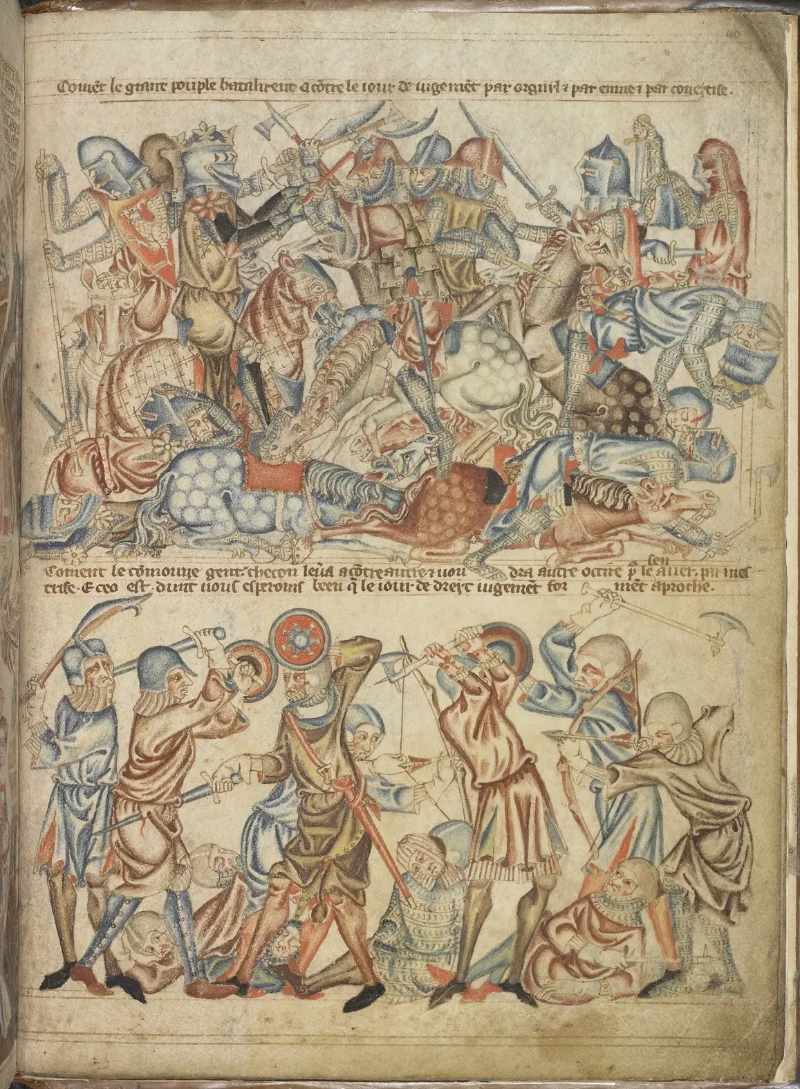 Чрезвычайно «живописная» иллюстрация из манускрипта 1320-1330 гг., изображающая сражения знати и простолюдинов. Сверху: знатные рыцари сражаются друг с другом верхом. Они в полном вооружении, включая бацинеты с большими подвижными забралами; один держит щит с изображением виверны**, у другого на колене шипастый полейн***. У короля забрало с решёткой, а на плечах — наплечники в форме звезды. Оружие — топоры, фальшионы и прямые мечи. Внизу: простолюдины бьются друг с другом в пешем строю. Их доспехи легче, включая бацинеты без забрала. На иллюстрации изображены фальшион, глефа, мечи, топоры и два лука со стрелами. «Холкхэмская иллюстрированная Библия». Британский музей, Лондон