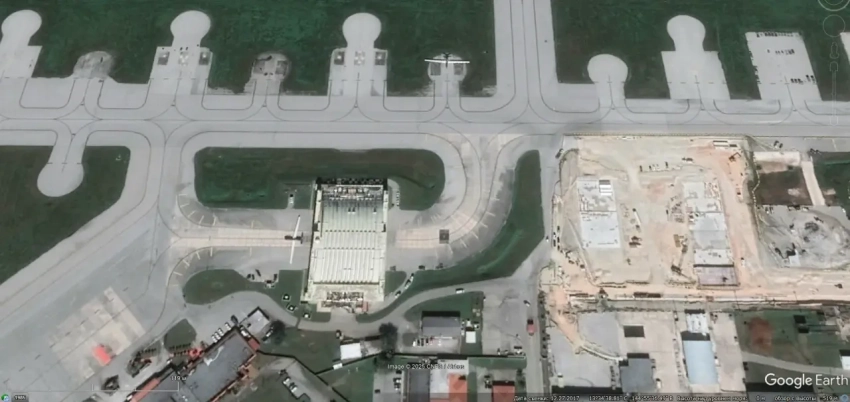 Спутниковый снимок Google Earth: самолёт ДРЛО Boeing E-3G Sentry и другая авиационная техника на территории авиаремонтного предприятия, расположенного на авиабазе Тинкер