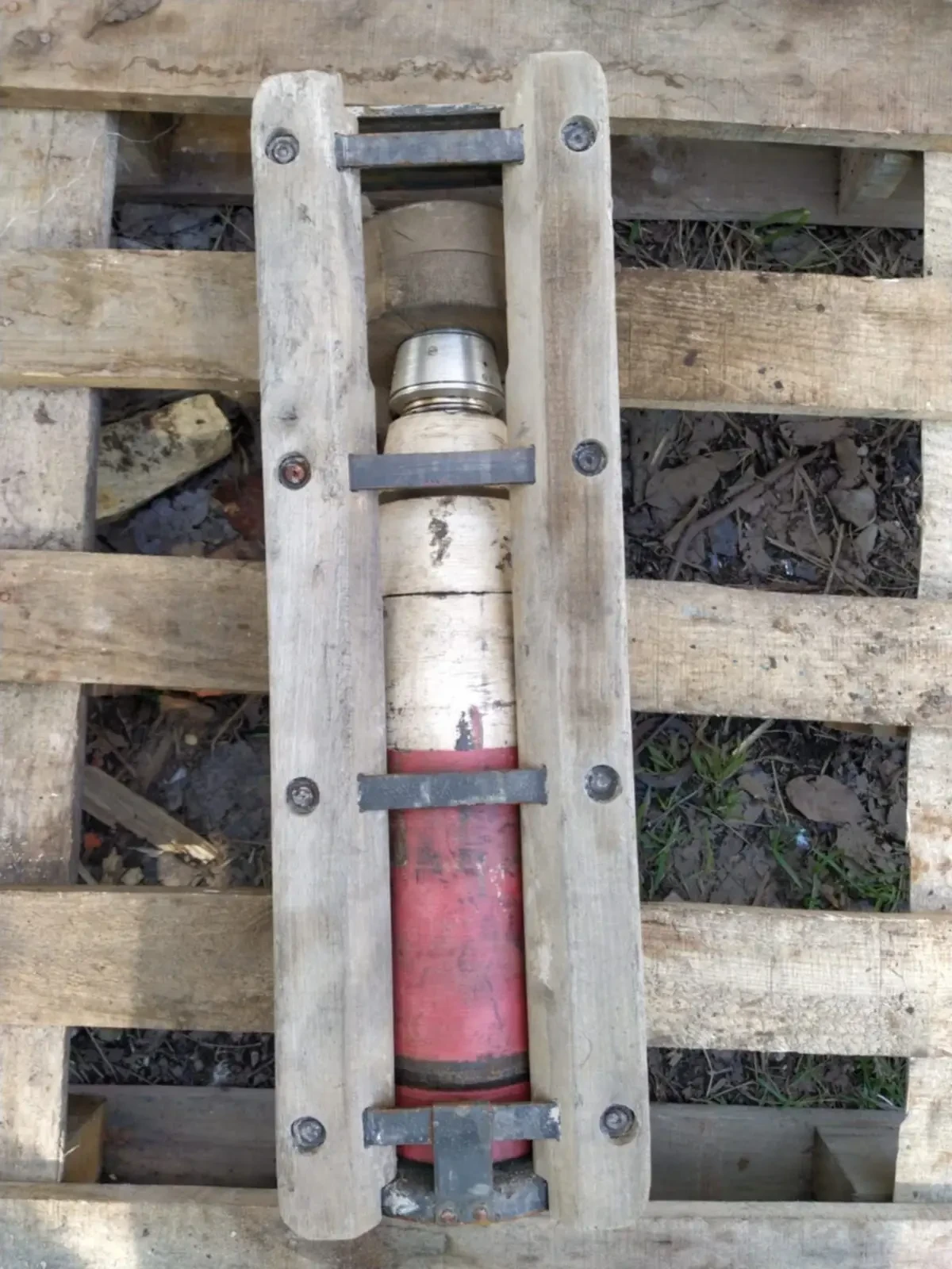 105-мм агитационный снаряд помещён в деревянный лоток с металлической арматурой для транспортировки