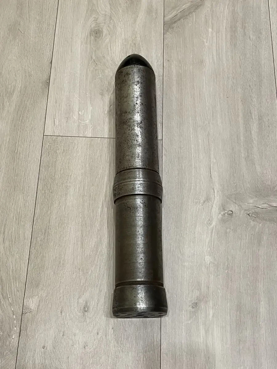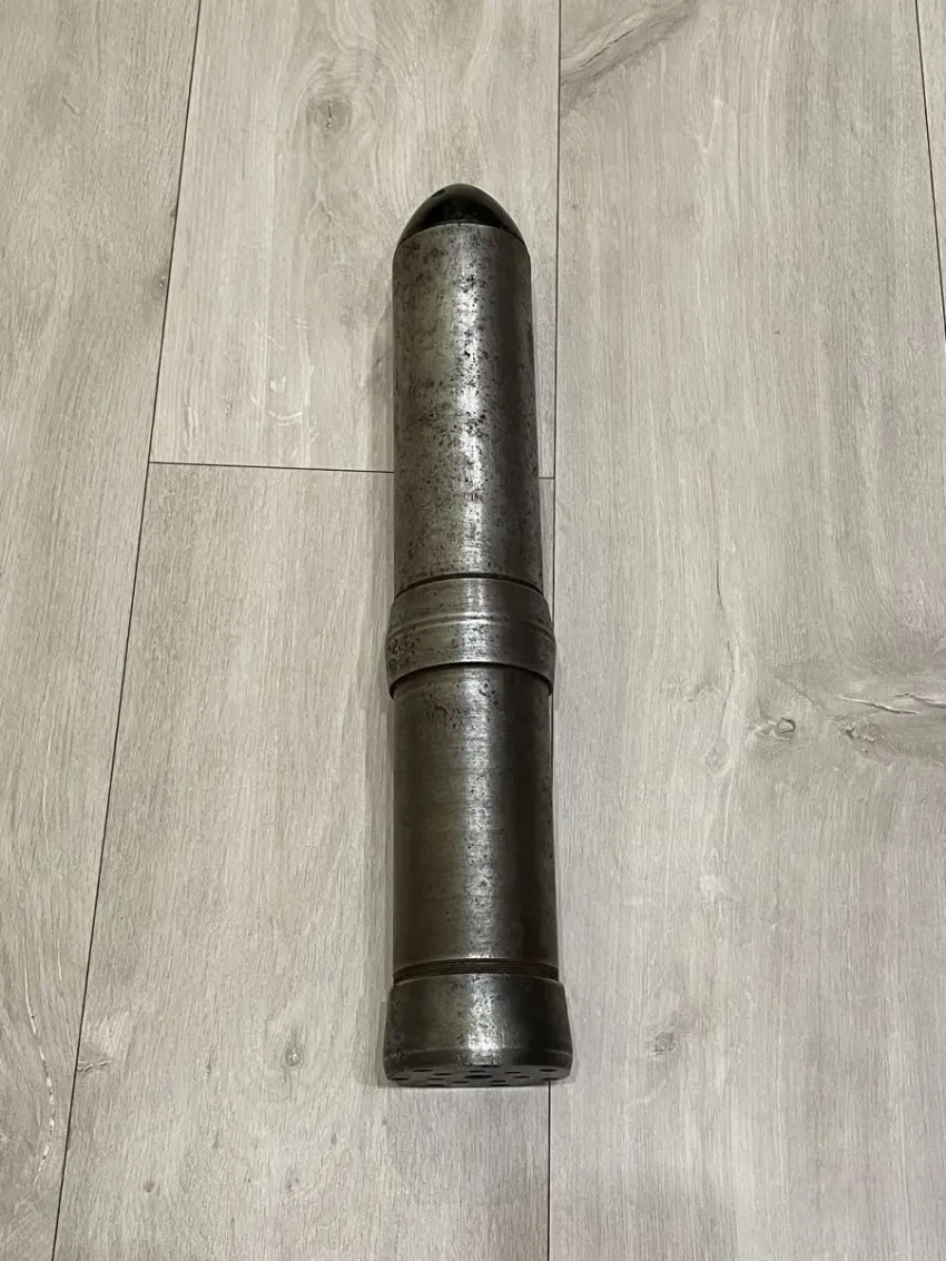 105-мм агитационный снаряд рядом с деревянным лотком, в котором данные снаряды транспортировались
