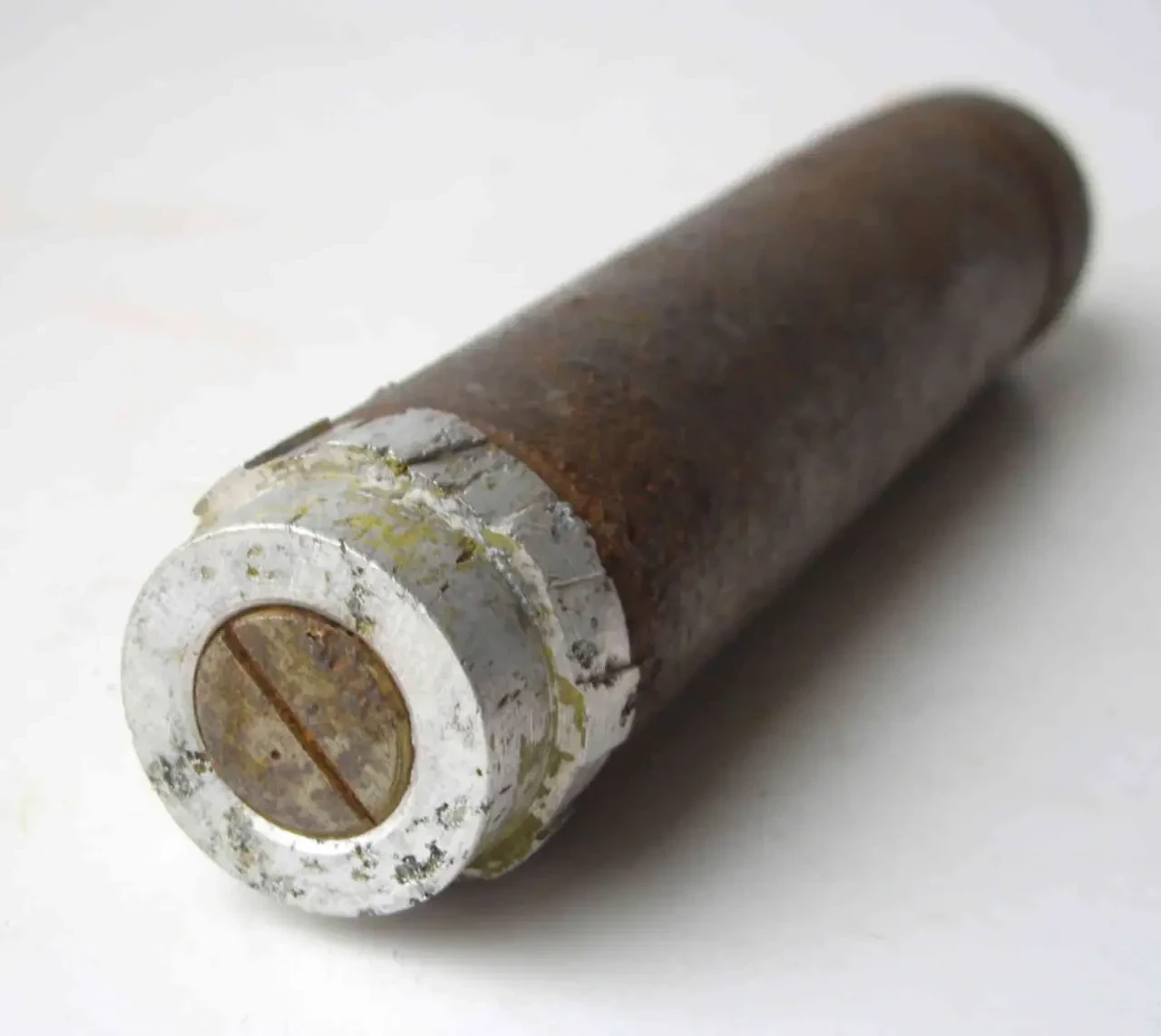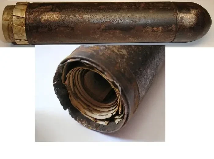 Открытый корпус 30-мм агитационной гранаты с листовками внутри