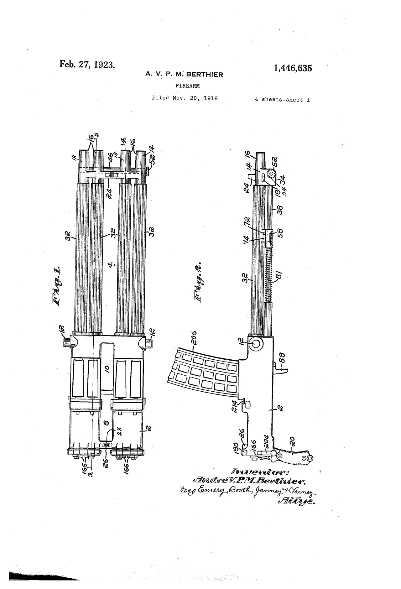 Один из «пулеметных» патентов Бертье. Четыре ствола, четыре магазина!