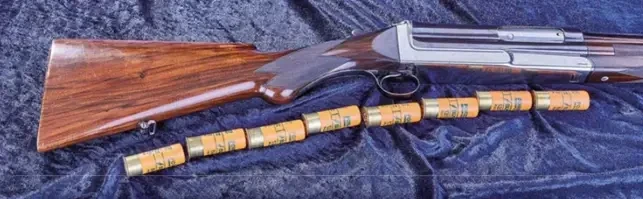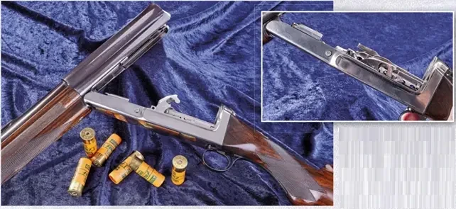 Но и это ещё не всё о заряжании. После того как магазин ружья опустошен, затвор остаётся в заднем положении. Тогда можно просто вложить патрон сбоку через окно выброса. Нажатие на кнопку, расположенную снаружи слева внизу на ствольной коробке, освобождает затвор, и он, захватывая патрон, движется вперёд. После этого ружьё снова можно переломить и заново заполнить магазин описанным способом.