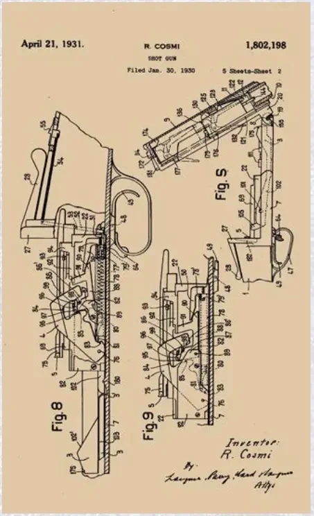 Косми долго экспериментировал, прежде чем создать свой неповторимый проект ружья — вероятно, это произошло около 1920 года. Большинство источников указывает, что первый прототип Родольфо Косми представил в 1925 году, то есть ровно сто лет назад. Разумеется, изобретение было запатентовано: соответствующий патент США № 1 802 198 был выдан 21 апреля 1931 года.