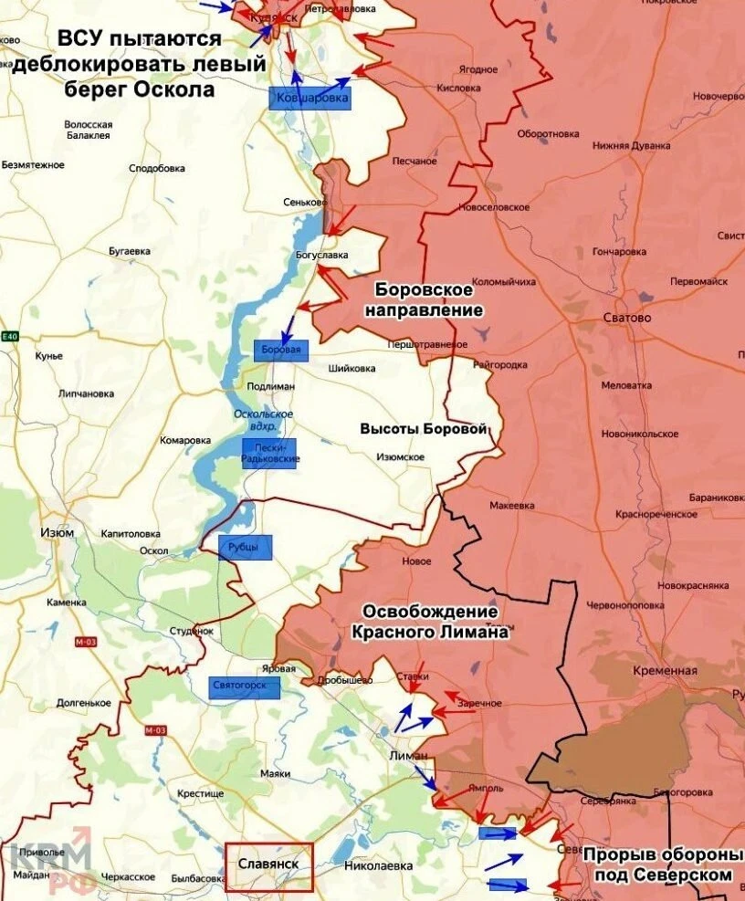 На Краснолиманском участке ожесточённые бои в районе Красного Лимана, Дробышево, Ставков. В районе Яровой есть тактические успехи. Украинские власти объявили срочную эвакуацию семей с детьми из Святогорска и 8 соседних сёл, информирует Олег Царёв в своём Telegram-канале.