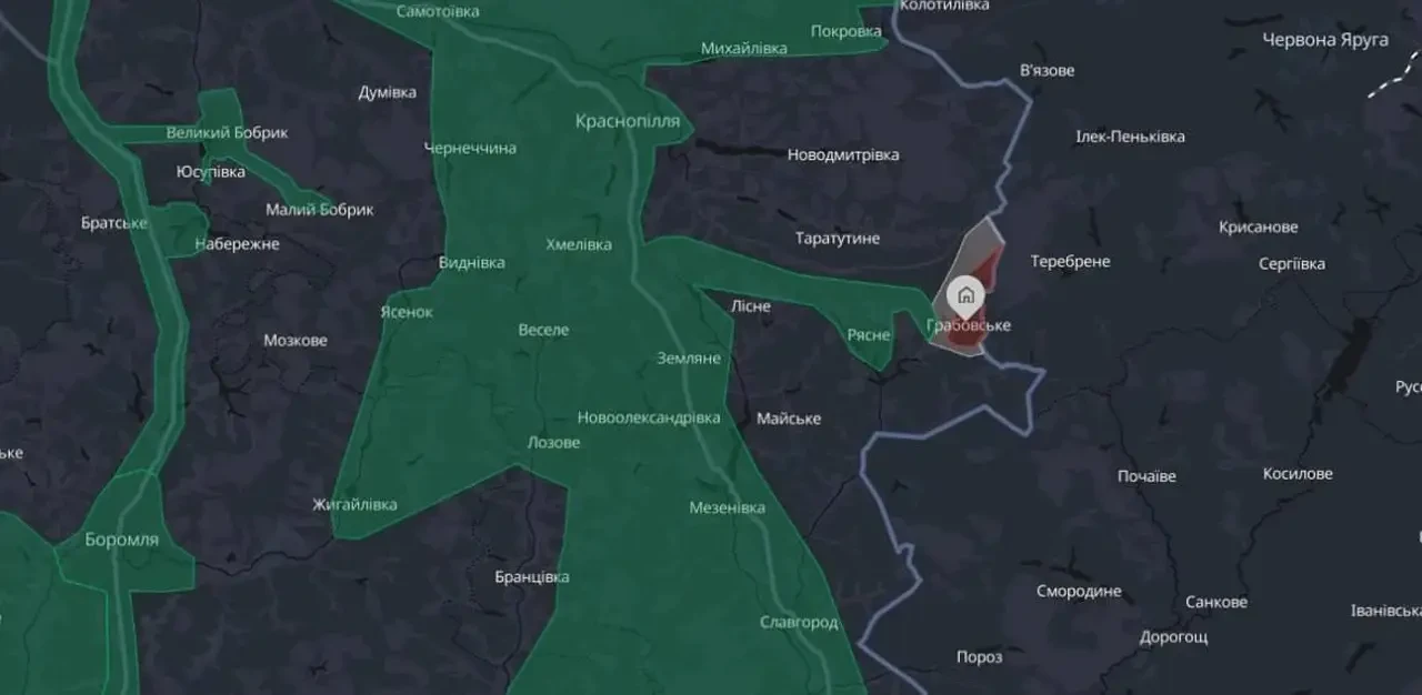 Аффилированный с ГУР ресурс DS пишет, что Грабовское потеряно, «но там продолжаются бои». Обращает на себя внимание опубликованная украинская карта. На ней зелёным цветом оказались нанесены полосы обороны ВСУ на востоке Сумской области.