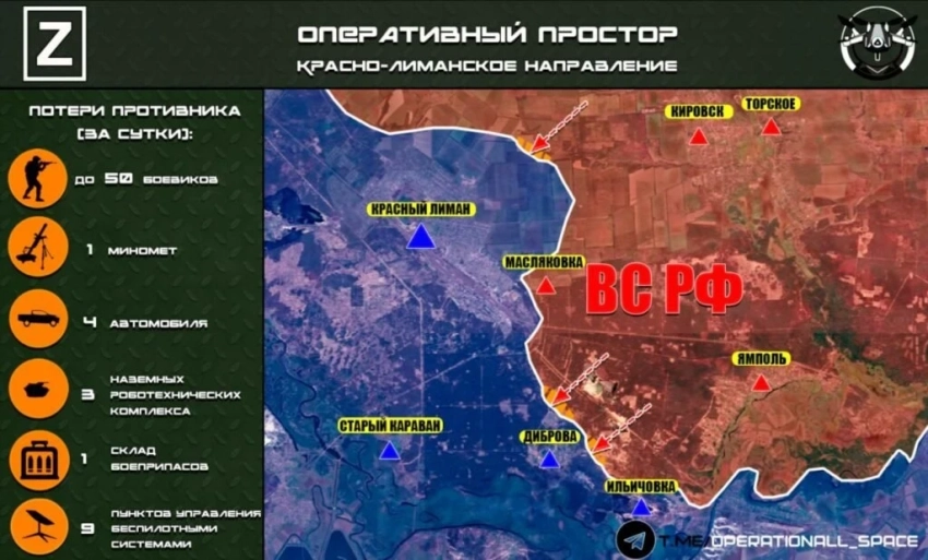На Краснолиманском направлении ВС РФ улучшают тактическое положение севернее Красного Лимана, ведут бои на участке Диброва-Озёрное.