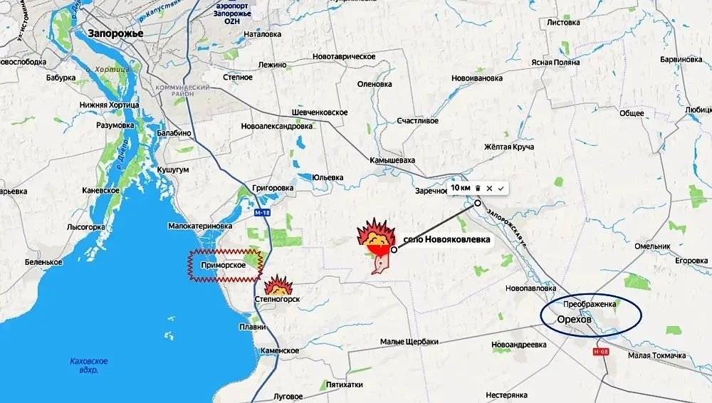 Это наступление более важно тем, что российская армия ведет охват крупного города Орехов с восточного (для гарнизона противника) фланга. От Новояковлевки до важнейшей трассы Н-08 и железной дороги, соединяющих Орехов с Запорожьем, по прямой около десяти километров. Это означает, что снабжение группировки ВСУ в крупнейшем городе на юго-восточных подступах к областному центру Запорожья уже под полным контролем беспилотной авиации и артиллерии ВС РФ.