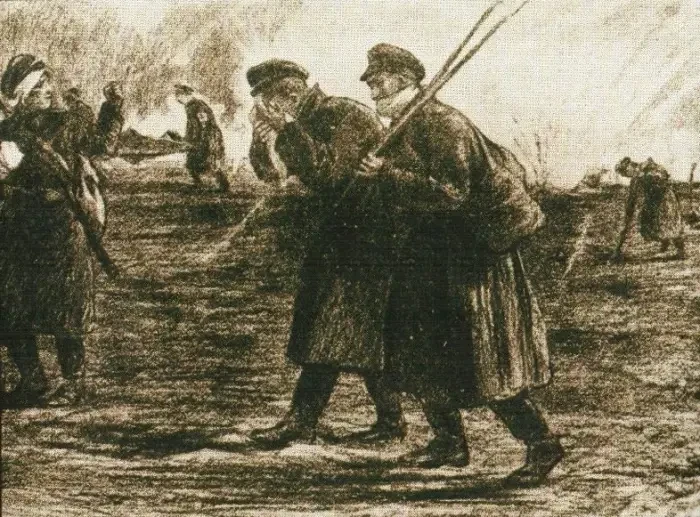 Началось бесславное отступление к Ростову-на-Дону. Состояние армии, которую фактически погубил Корнилов, передает этот рисунок этого неизвестного белогвардейца: