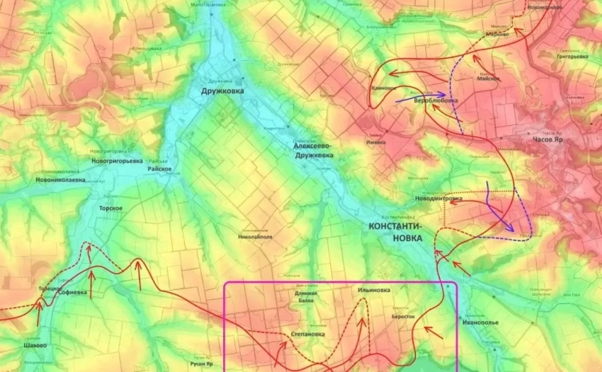 Кроме того, российские подразделения были вынуждены откатиться из Новодмитровки, где противник смог незначительно вклиниться в оборону. Вместе с тем успехи ВС РФ фиксируются южнее - в районах Степановки, Ильиновки и Берестка. Основная задача здесь - выход к южным окраинам Константиновки.