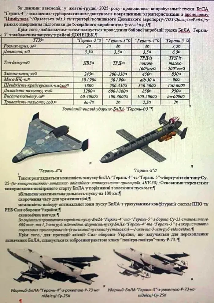 По мнению противника, российские конструкторы прорабатывают варианты применения БПЛА «Герань-5» с авиационных носителей, в частности, самолетов Су-25, с целью увеличения дальности и удешевления использования. Отдельно рассматривается возможность оснащения аппарата ракетами класса «воздух-воздух» Р-73 для противодействия украинской авиации.