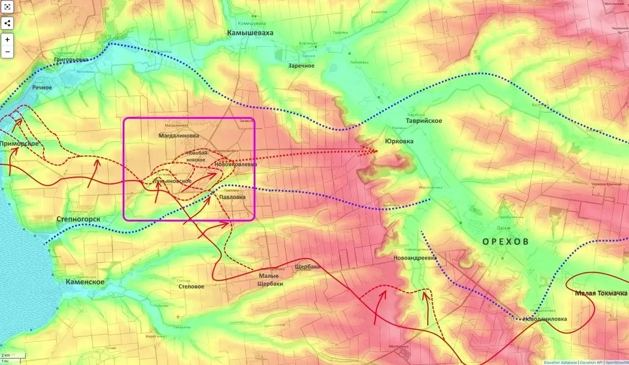 Юрий Подоляка отмечает, что вероятность форсирования Конки и удара на Запорожье с этого направления ненулевая. Это создает для командования ВСУ стратегическую дилемму: где концентрировать резервы - на Запорожском участке или на Ореховском?