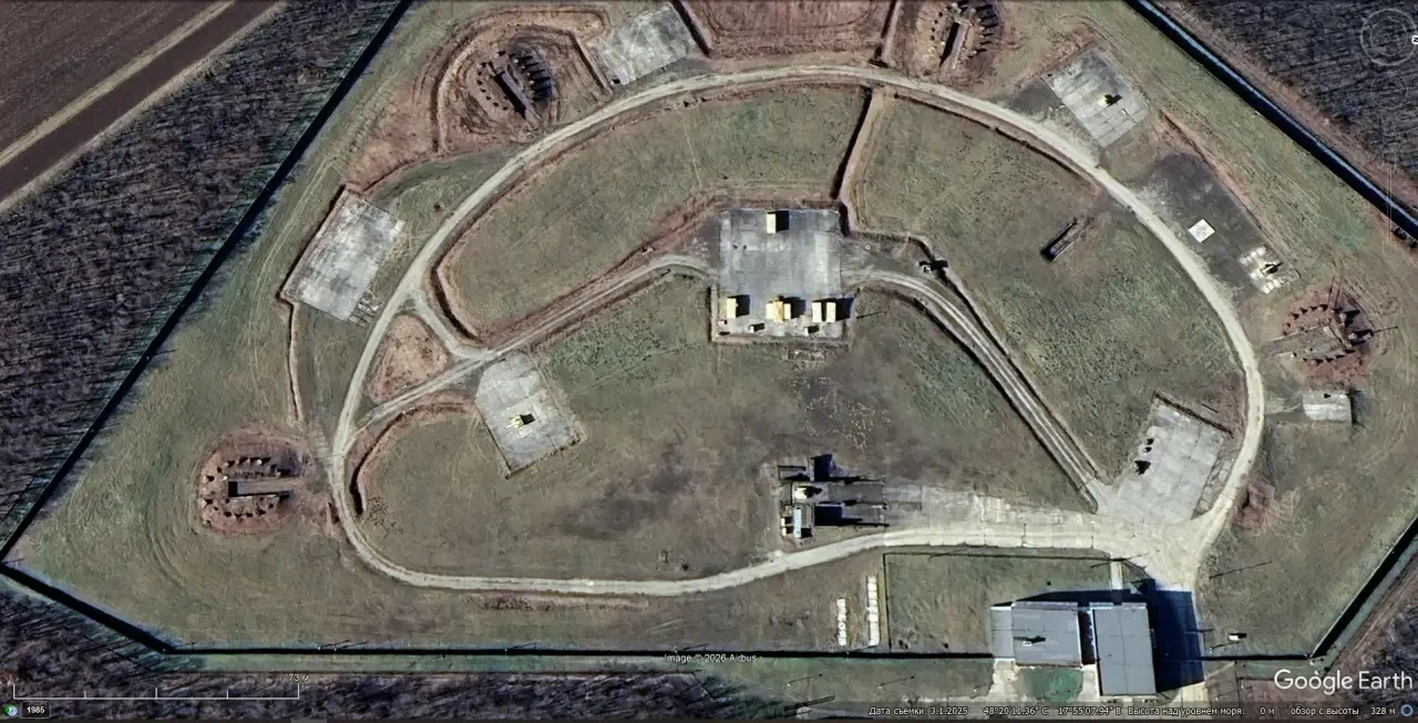 Спутниковый снимок Googlе Еarth: пустая огневая позиция ЗРС С-300ПМУ-1 в 3 км восточней аэродрома Казантзакис. Снимок сделан в феврале 2025 года