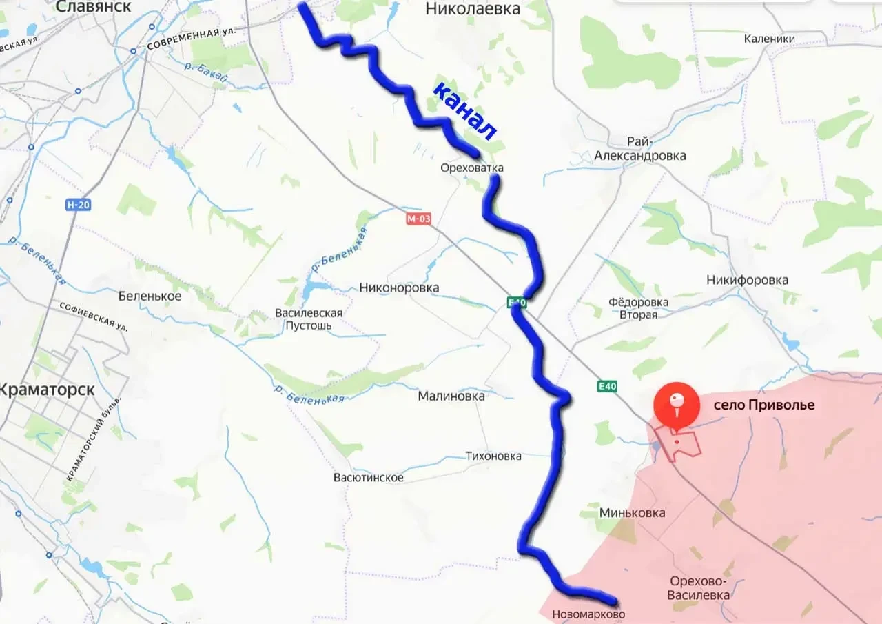 Естественной преградой для продвижения между Привольем и Славянском является канал Северский Донец-Донбасс, и по его западному берегу противник пытается выстраивать оборонительный рубеж. Но менее чем в 10 км южнее российские войска уже вышли на правый берег канала, а потому подразделения ВСУ на создаваемом рубеже могут столкнуться и с крайне болезненным фланговым ударом. Мало того, армия России может этот рубеж обороны и вовсе обойти от Новомарково к западу, значительно приблизившись к Краматорску.