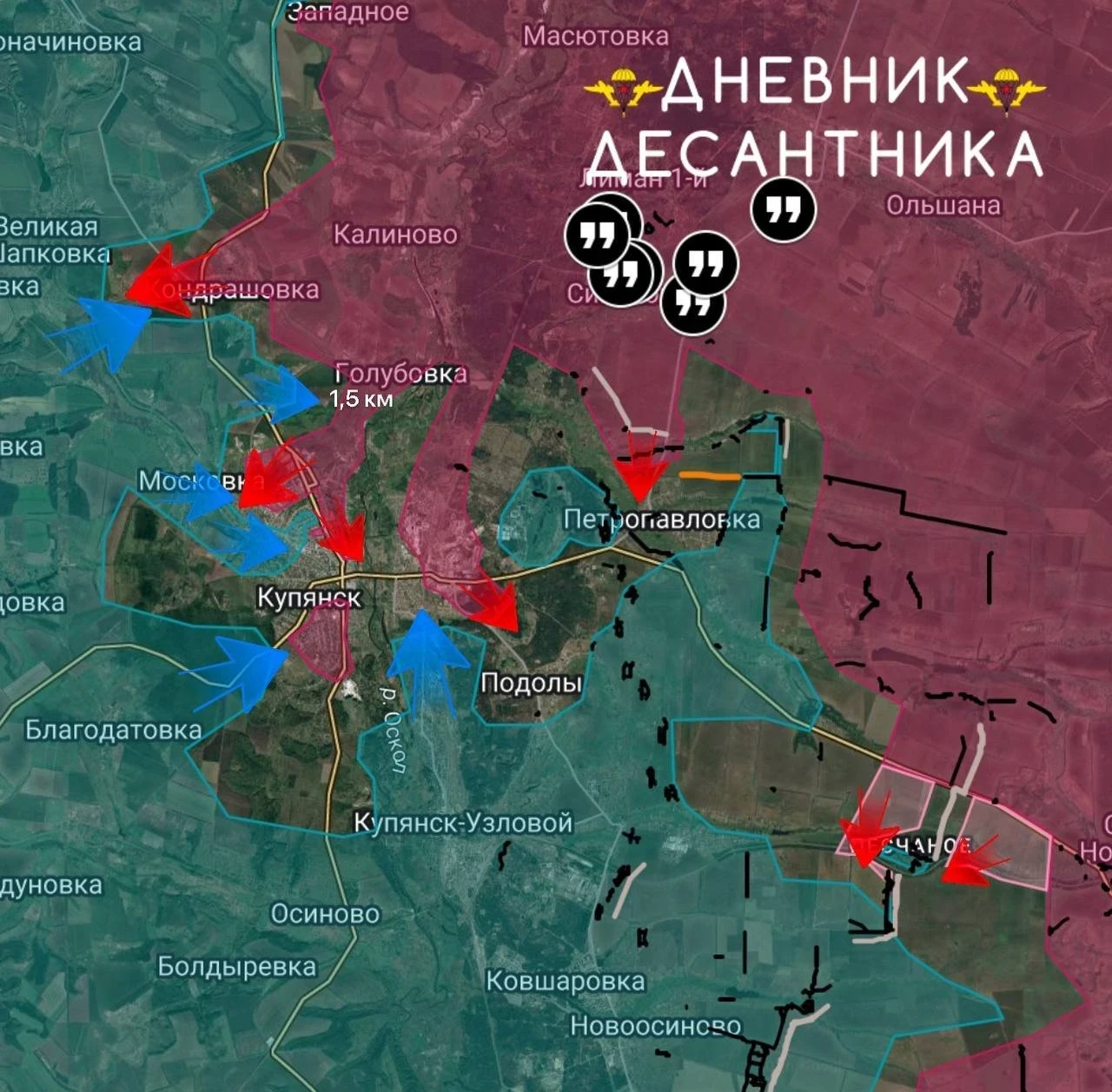 Российские военкоры информируют о том, что бои переместились в центр Купянска. На восточном берегу ВС РФ контролируют север Подолов и подходят к центру Куриловки. Село Песчаное взято в охват с флангов.