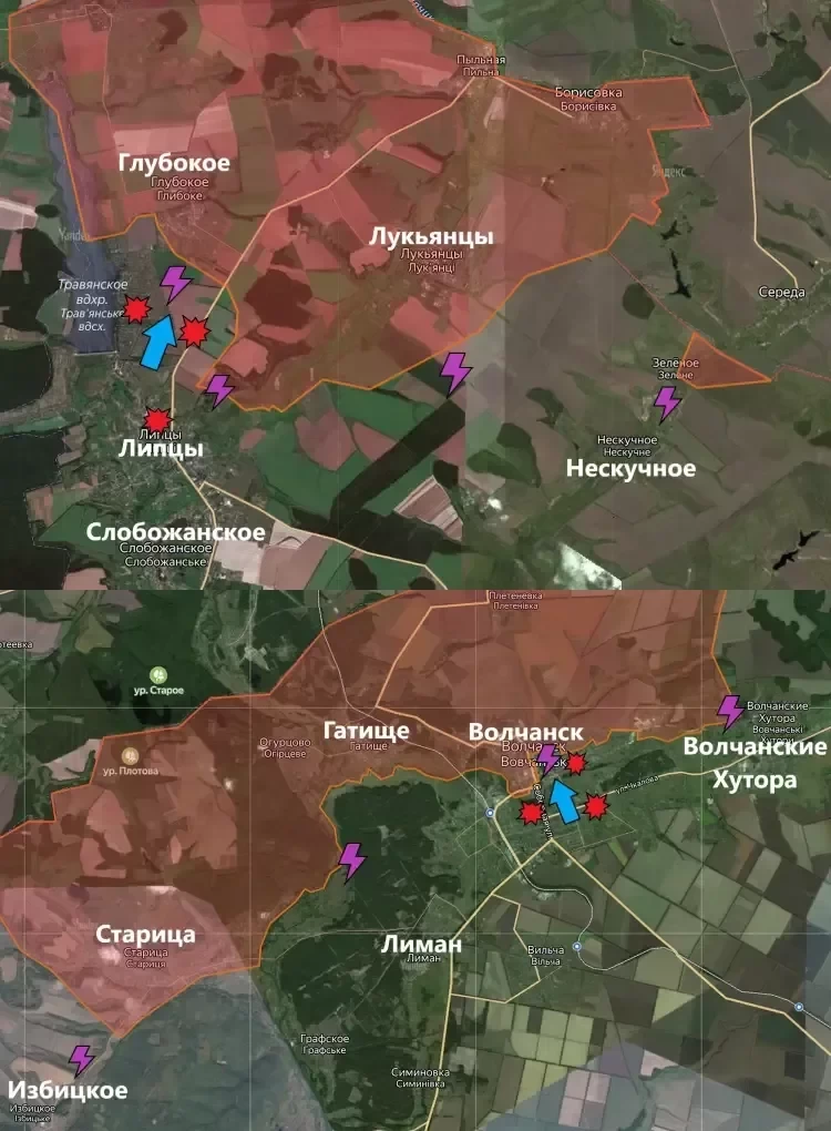 Подразделения ВС РФ атакуют на северо-востоке от Липцев. Нашим бойцам добиться серьезных успехов также не удаётся. Помимо этого, бои идут неподалеку от важных тактических высот южнее Лукьянцев, пишет PulsePen.
