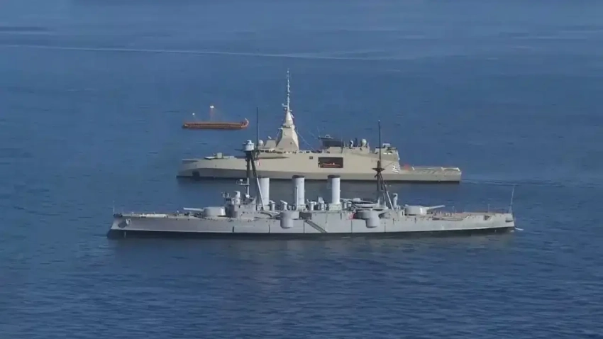 Kimon (F-601) проходит мимо крейсера Georgios Averof типа Pisa – формального флагмана ВМС Греции: