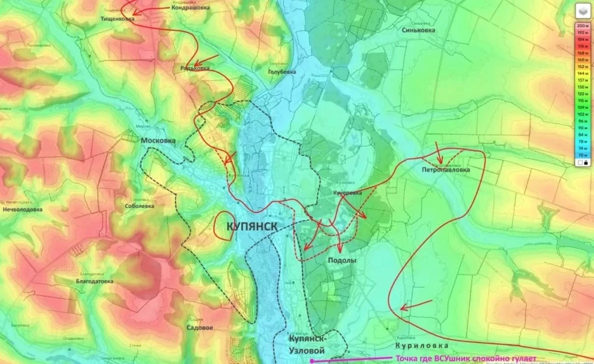 Сложной продолжает оставаться ситуация в районе Купянска. Несмотря на нашумевший доклад главы Генштаба Валерия Герасимова об освобождении Купянска-Узлового, на большинстве транслируемых в сети интерактивных карт «красного» закраса у Купянска-Узлового нет. Противник считает, что ГШ ВС РФ на фоне подготовки к новому раунду переговоров занимается «введением в заблуждение», чтобы в случае «обмена территориями» якобы обменять то, что «армия России не контролирует».