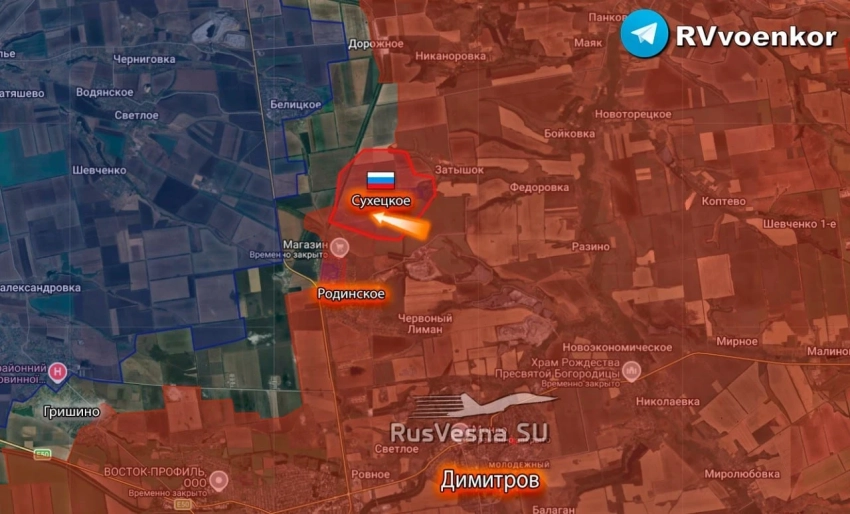 На Красноармейском направлении армия России развивает успех к северу от красноамрейско-димитровской агломерации: наши войска вышли к западной окраине второго пруда в Гришино. Также МО РФ объявило об освобождении Сухецкого. Выше по фронту ВС РФ готовят плацдарм в районе Шаховского укрепрайона перед линией обороны ВСУ вдоль реки Грузская. Линия укреплённых позиций ВСУ начинается в Золотом Колодезе, куда осенью прошлого года заходили наши передовые подразделения, отвлекая на себя силы врага во время боёв за Красноармейск. Завершается эта линия в Красном Куте. Армии России предстоит взять участок со сложной пересечённой местностью, балками, оврагами, а район Красного Кута во время дождей и паводков становится непроходимым из-за глинистой почвы. Вероятно, российские части будут рассекать этот участок по центру в районе Грузского, одновременно охватывая фланги. В частности, наши начали продавливать правый фланг в районе Павловки.