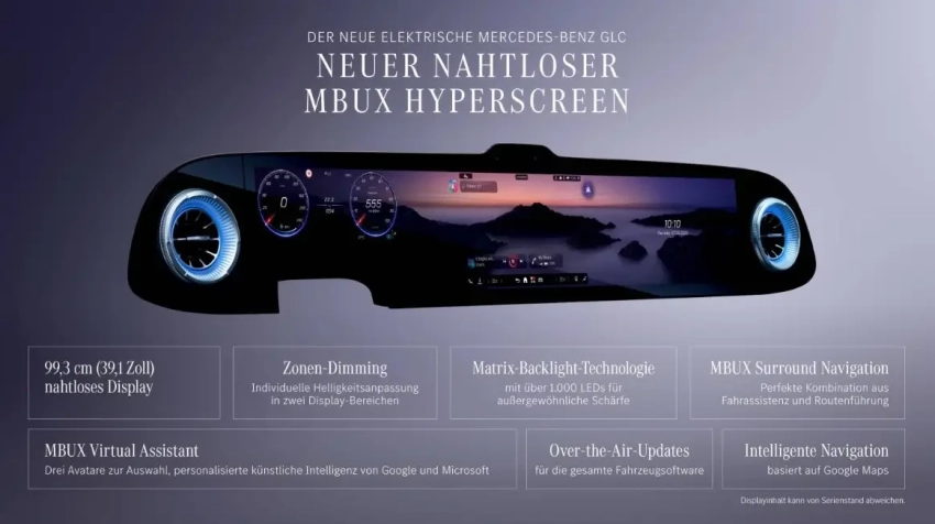 В отличие от Hyperscreen в EQS, где даже приборная панель размещена под общей стеклянной поверхностью, здесь 12,3-дюймовый дисплей водителя (при желании можно заказать с трёхмерным изображением) по-прежнему выполнен как отдельный элемент. При этом 14,4-дюймовый центральный экран и 12,3-дюймовый дисплей пассажира на переднем сидении объединены единой стеклянной панелью, формируя визуально цельное технологичное пространство.