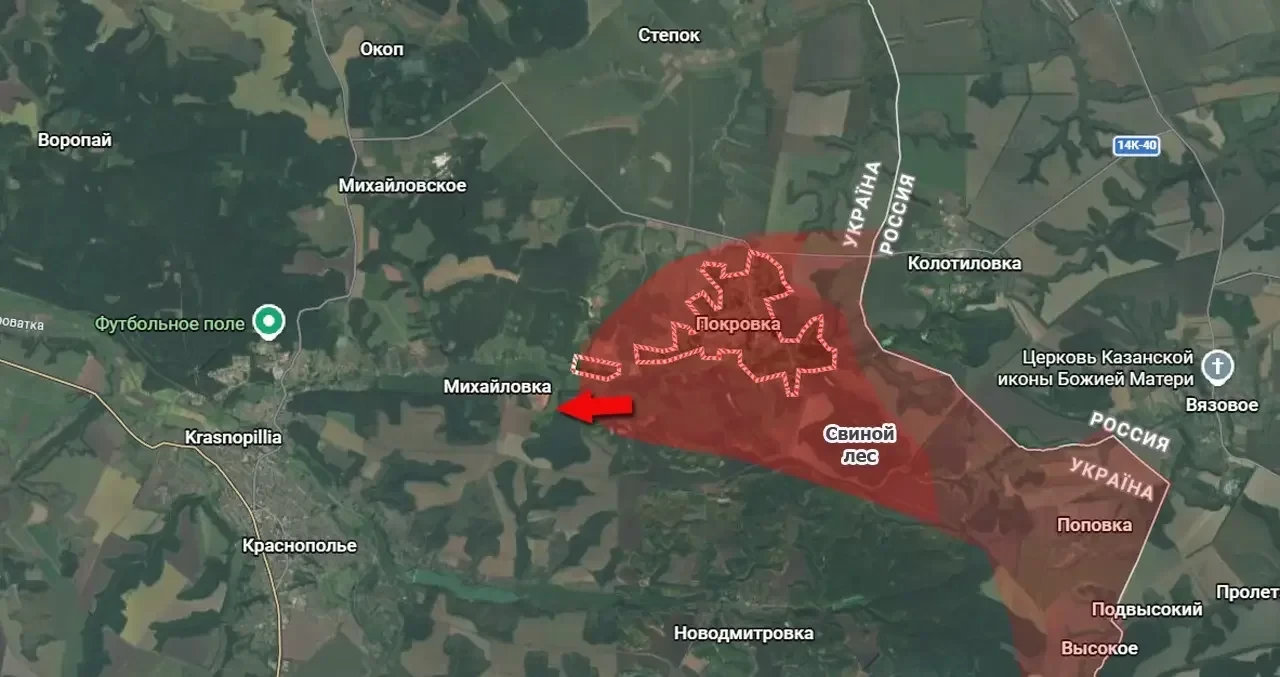По поступающим из Сумской области данным, ВС РФ взяли под полный контроль село Покровка и урочище Свиной лес. Покровка находится близ границы с Белгородской областью, примерно в 32 км восточнее областного центра - города Сумы.