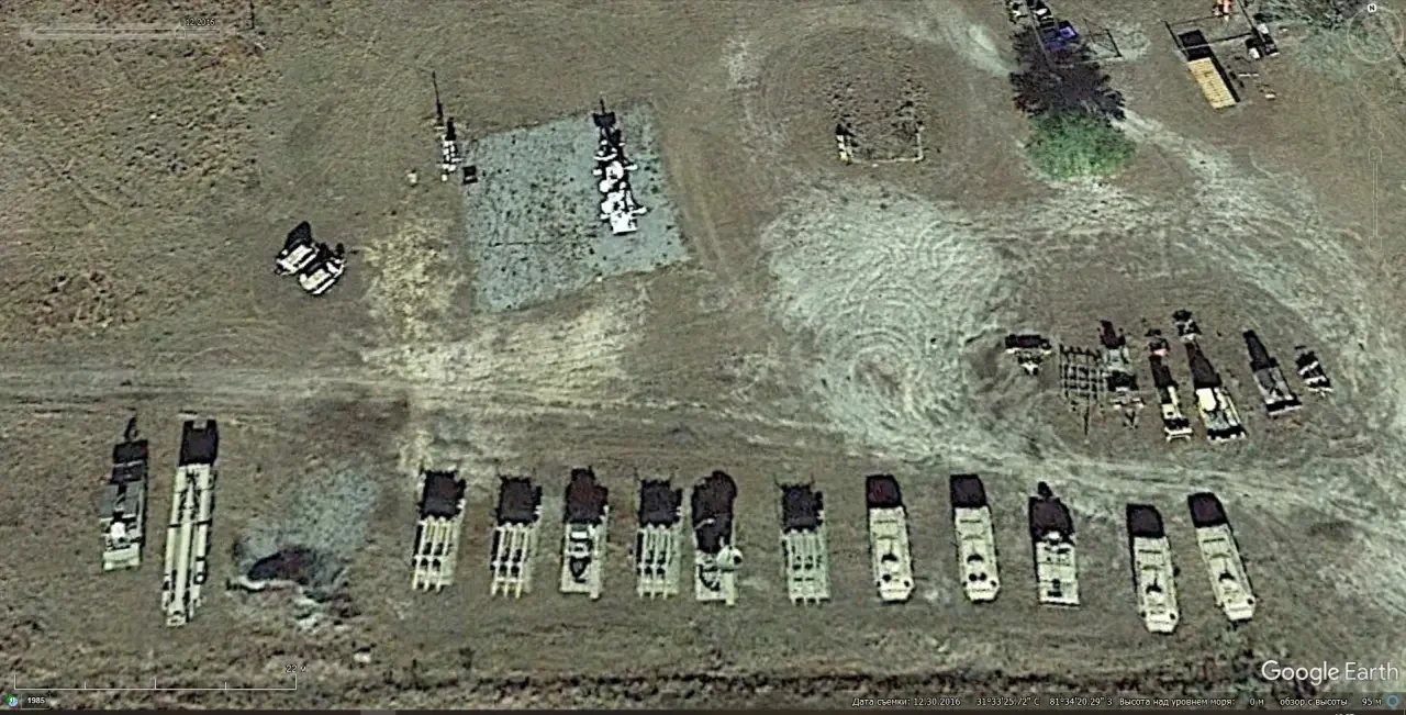 Спутниковый снимок Google Earth: ЗРК «Оса», мобильная пусковая установка ОТРК 9К72 «Эльбрус», СПУ 2П25 и СУРН 1С91 из состава ЗРК «Куб», между БТР-70 стоит ЗСУ-23-4. Позади на площадке имитаторы режимов работы СНР советских ЗРК. Снимок сделан в декабре 2016 года
