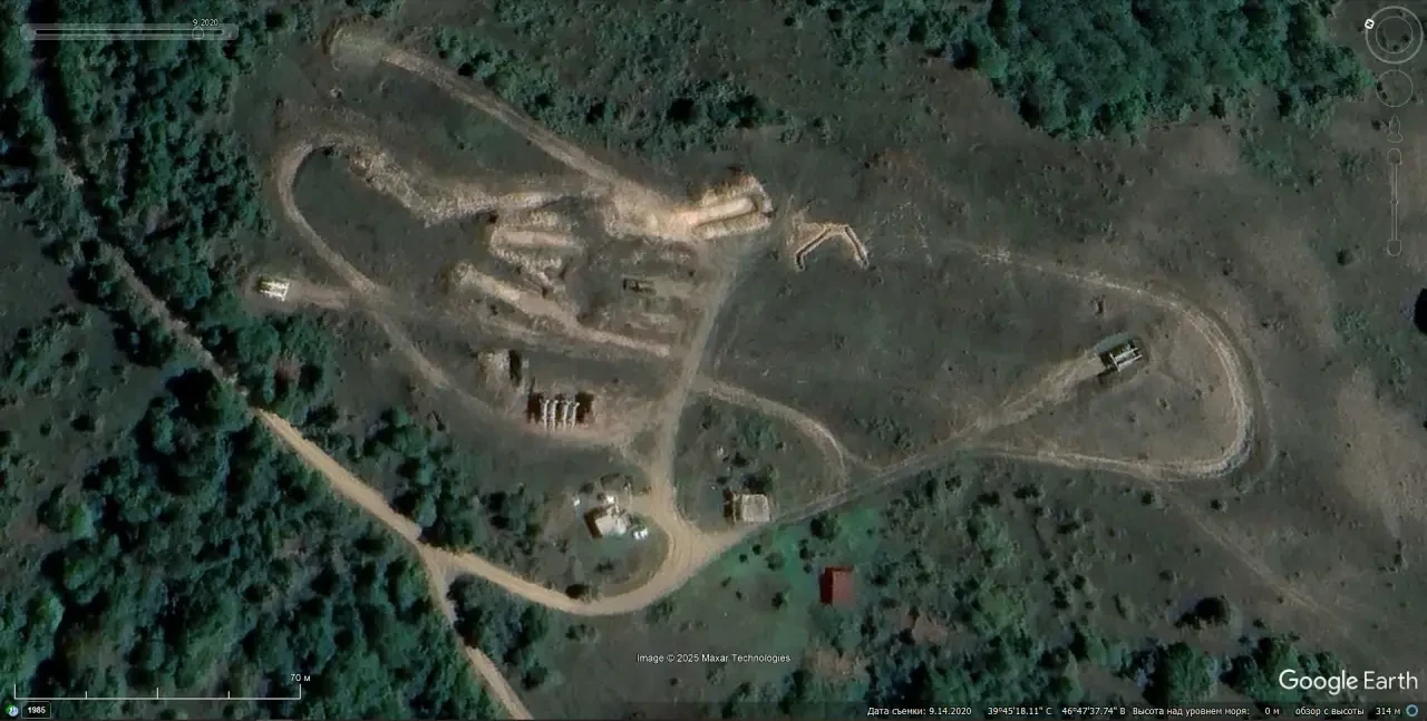 Спутниковый снимок Google Earth: позиция ЗРК «Круг» в 1 км южнее Шушикенда. Снимок сделан 14 сентября 2020 года