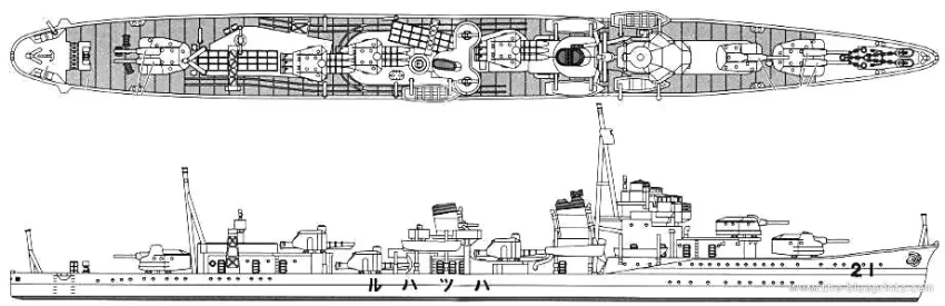 План-схема эсминца «Хацухару». Весьма подробный, указаны даже смещения торпедных аппаратов и механизмов перезарядки от оси корабля для лучшего равновесия