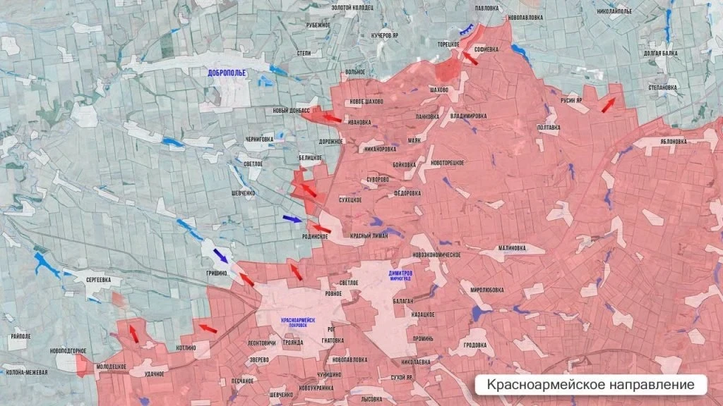 На Красноармейском (Покровском) направлении, по оценкам сводок, картина существенных изменений не демонстрирует. На западе продолжается развитие наступательных действий в сторону Сергеевки, а на севере бои смещаются к району Золотого Колодезя.