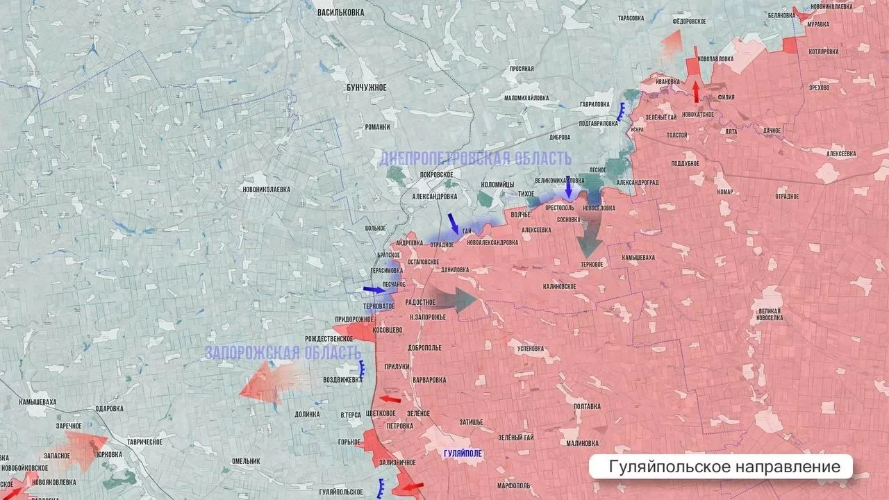 В свою очередь на Гуляйпольском направлении наметился прогресс. ВС РФ активно взламывают оборонительные порядки ВСУ на широком участке фронта - от Верхней Терсы до Рождественского.
