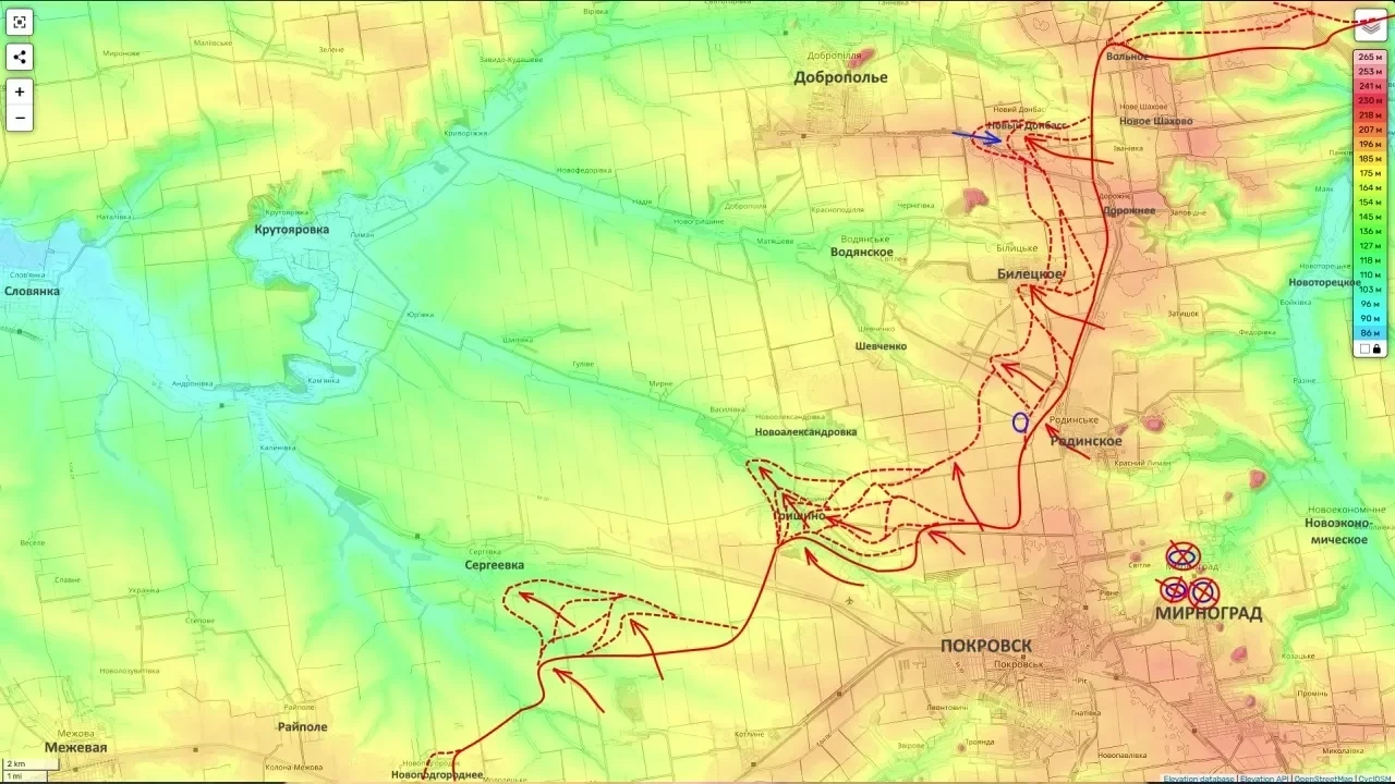 Согласно его сведениям, войска РФ активно наступают также к югу и юго-западу от Доброполья. По словам Подоляки, продвигающиеся со стороны села Гришино российские военные стремятся выйти в тыл группировке противника в Доброполья, которую атакуют в лоб подразделения РФ в районе Нового Донбасса и Белицкого.