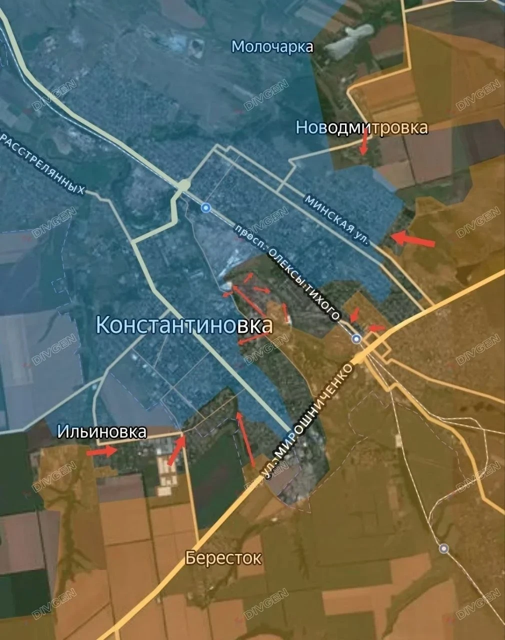 Продвигаясь в самой Константиновке, ВС РФ развивают глубокий охват города с флангов. Бои идут на южной окраине Долгой Балки, контроль над которой позволит выйти к северной части Константиновки с запада и открыть выход к Николайполю. Со стороны Ильиновки наши подразделения атакуют Константиновку, продвигаясь к юго-западной стороне города.