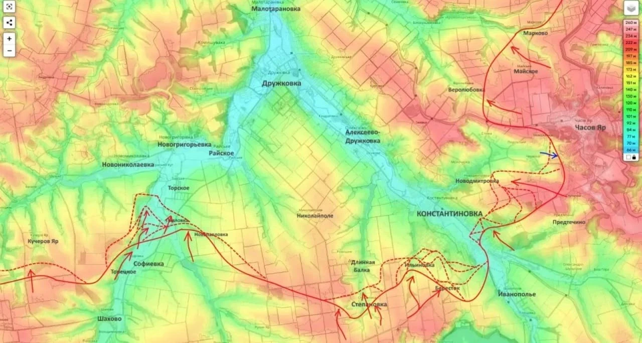 Основной горячей точкой является Константиновка. Продвижение российских штурмовых отрядов характеризуется как тяжёлое и вязкое, однако оно не останавливается ни на час.