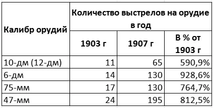 Но, по всей видимости, резко возросла интенсивность учений. По Н. Пахомову получается, что броненосный крейсер «Рюрик» в 1902 г. израсходовал 1239 патронов калибром 37-мм. Что при наличии 26 орудий калибром в 120-мм и более, из которых проводились стволиковые стрельбы, дает средний расход в 47-48 снарядов на орудие. В то же время в 1907 г. разрешалось использовать до 450 снарядов на орудие, то есть десятикратно больше.