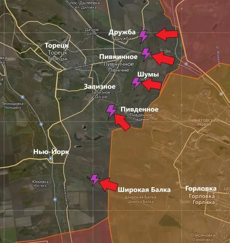 На Торецком направлении к востоку и северо-востоку от Дружбы подразделения ВС РФ выдавливают врага с его позиций. Информация о взятии двух важных тактических высот к западу от населённого пункта Шумы на текущий момент, увы, не подтверждается, сообщает PulsePen. На окраинах Нью-Йорка идут встречные бои. По Пивничному и самому Торецку работают артиллерия и авиация ВС РФ.