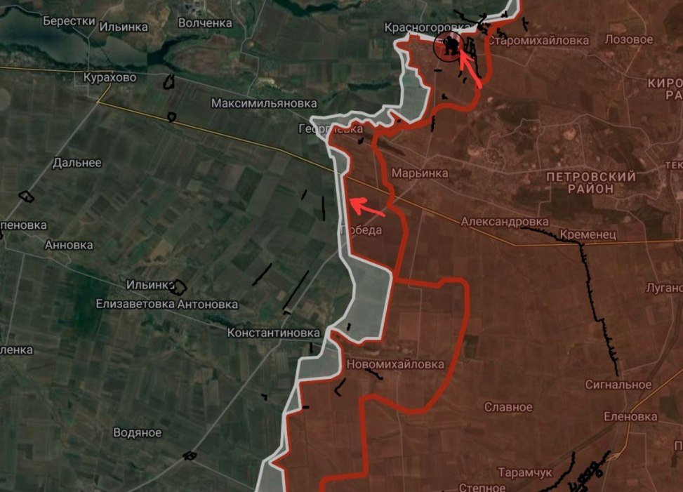 На Донецком направлении ВС РФ продвинулись со стороны Георгиевки до окраин улиц Центральная и Октябрьская в Максимильяновке, расширив зону контроля юго-западнее Победы.